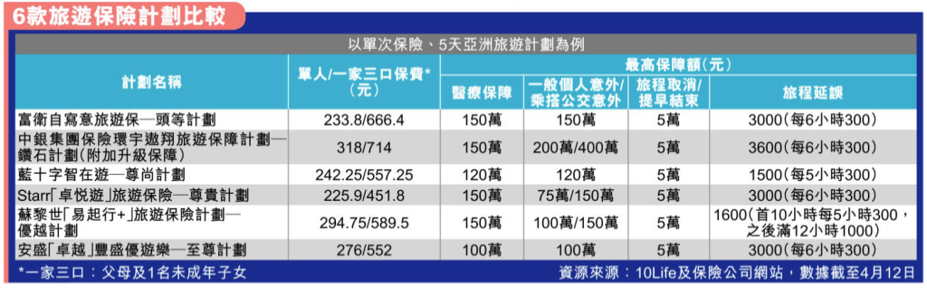 保费方面,以复活节5天亚洲行程为例,参考10Life平台4月12日6间保险公司的报价,单人保费介乎约226元至318元,父母连同一名未成年子女所需保费介乎在452元至714元,部分保费价格享有该平台提供的折扣优惠,但也需留意即使平台显示有些保费打折,实际折扣与保险公司官方网站提供的折扣无异。比较6款计划的保费,以中银集团保险最贵,不过若经中银香港(2388)投保其计划,保费会较平,这样就不属保费最高的计划。因此,市民若想买保费较抵的心水旅游保险,都要花吓时间比较不同平台或渠道的保费水平。