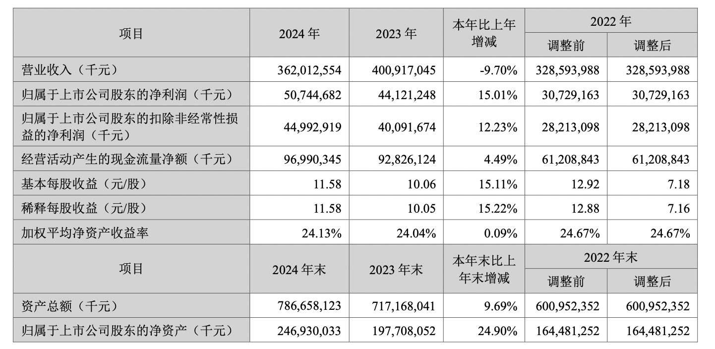而2024年,宁德时代实现营收为3620.13亿元,同比减少9.7%;归母净利润为507.45亿元,同比增长15.01%。