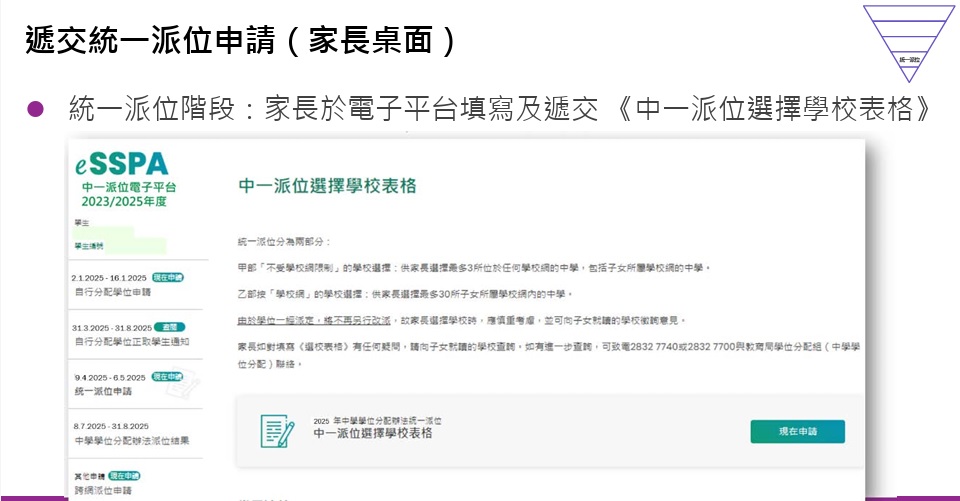 统一派位分为甲、乙两部分,甲部为全港校网选校,包括本区校网,要与全港学生竞争,计算机会首先处理,占统一派位的一成学额,最多可选三个志愿。乙部则为本区校网,与本区学生竞争,占统一派位的九成学额,最多可选30个志愿。派位程序是先派甲部,再派乙部。