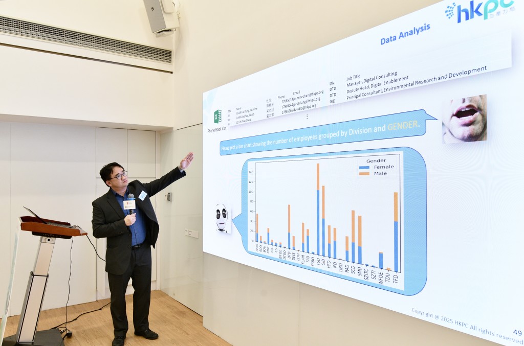 工作坊当日邀请了两位星级嘉宾进行专题演讲,其中团结香港基金公共政策研究院研究员谢颖昕,以“政策引领绿色转型”为题,探讨政策对企业实践ESG目标的影响,并分析如何在政策支持下协助企业绿色转型。紧接是香港生产力促进局绿色生活与创新部环保科技研发首席顾问卢志伟以“ESG X AI实战案例”为题,分享了AI技术在ESG数据分析中的应用案例,以及如何利用AI人工智能协助企业提升ESG表现。