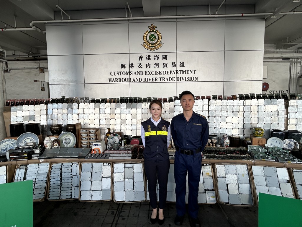 香港海关近日侦破一宗远洋船大型走私案,关员在一艘驶往天津货轮中,揭发走私犯透过货柜走私大量如电脑显示卡、电路板等昂贵电子零件,并利用陶瓷工艺品作掩饰。 涉案货物市值逾7000万港元,若成功走私可逃税700万元。