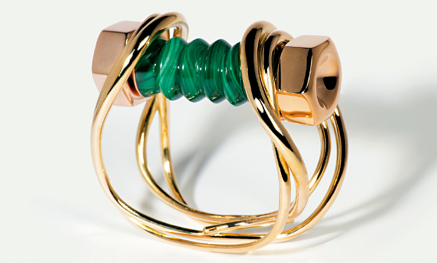 ▲New Rebel Bolt手镯,以18K黄金及玫瑰金配孔雀石。($421,580)