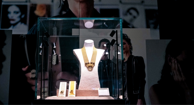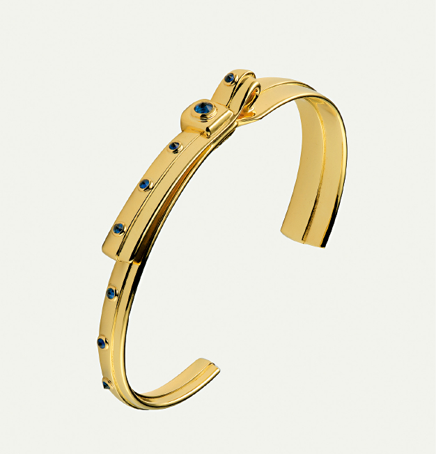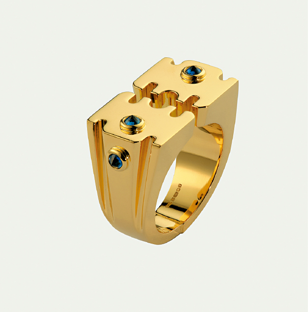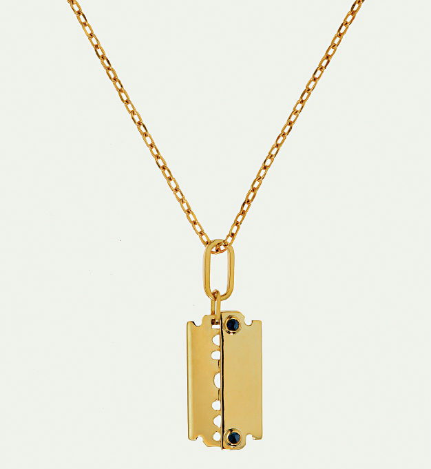 ▲新系列以18K黄金材质重新演绎剃刀刀片图案,作品包括镶缀密钉蓝宝石的铭牌指环、项链、耳环及手镯。