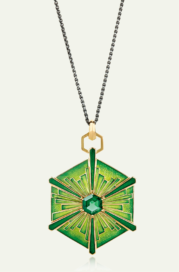 ▲属于Hannah Martin自家品牌系列的Delirium Trance Amulet吊坠项链,18K黄金镶嵌一枚重2.74卡的祖母绿及珐琅。($370,800)