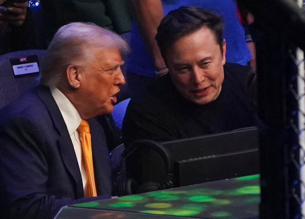 ▲美国总统特朗普和他的亿万富翁左右手马斯克13日在美国佛州迈阿密卡西亚中心观赏 “UFC 314”赛事。(路透)