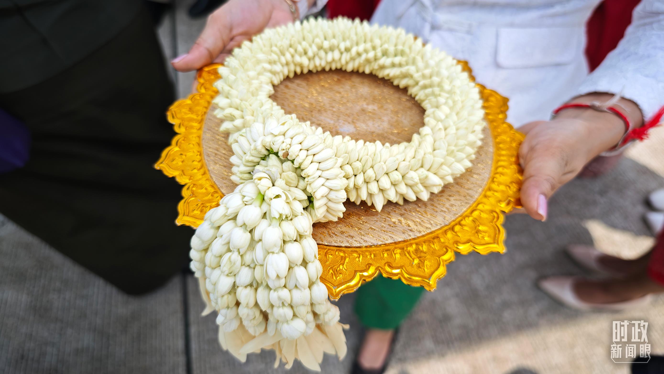 ▲柬埔寨王室珍娜公主向习主席献上的茉莉花手环。央广