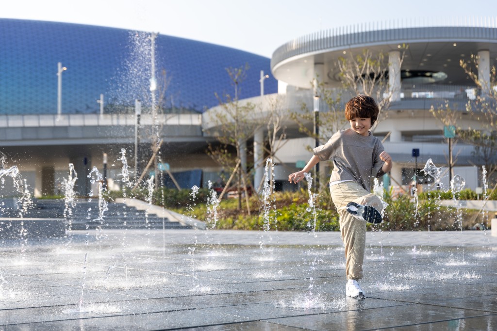 观景台对出的喷泉广场配备喷泉嬉水装置,搭配灯光效果,小朋友能够尽情玩乐!广场内又设有约130平方米的雨水花园,栽种原生植物,并透过设计收集及净化雨水作园内灌溉之用,实现可持续城市与社区发展的理念。同时,园区内在启德河沿岸设置亲水性阶梯座位,全长约320米的海岸堤阶,饱览河岸及绿色景致。