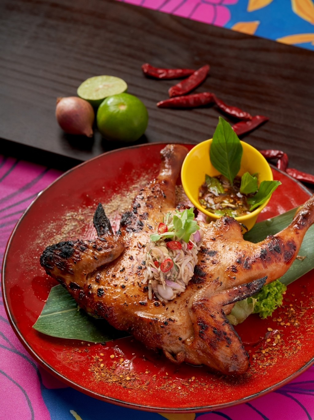 惹味的烤猪腩肉配辣虾酱,是用辣椒、干葱、蒜头、西红柿及甜酱油等调味,经过慢煮及烧烤工序,令猪腩肉吃起来丰腴滋味却不肥腻。泰式原只烧春鸡用椰糖、芫荽头等腌过再烧,伴香茅南姜酱汁、干葱碎、柠檬叶及香茅吃,肉质嫩滑鲜美,别具地道泰菜风味。