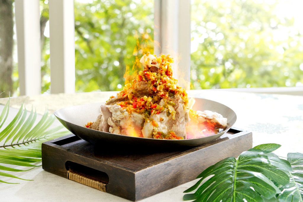 经典的泰式火山骨选用肉质滑嫩的猪腩排骨,混合蔬菜及胡椒汤熬煮数小时,另伴绿色指天椒、红椒、干葱、蒜蓉、鱼露和辣椒酱等十多种香料制成的酱汁,上桌前再淋上酒点火释出香味,可满足多重感官的独特效果。泰式椰子鲜鸡汤是值得一试的泰菜,鲜鸡加入椰子水熬制,汤水香甜,鸡肉嫩滑,是富地道风味的泰国菜。