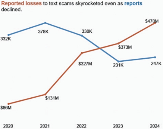 联邦贸易委员会(Federal Trade Commission)于日前公布了上一年度的诈骗统计数据。这份最新数据显示,2024年全国各地消费者举报的短信诈骗损失总额高达4.7亿元。尽管近年来当局接到的举报案件数量呈下降趋势,但去年的损失金额则较2020年的报告相比则高出了5倍。