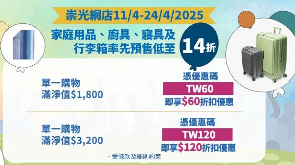 崇光感谢祭将于4月25日至5月25日分两阶段推出,而SOGO网店率先进行预售,名牌手袋、配饰、厨具、行李箱低至14折发售。SOGO崇光更同步推出3大优惠攻略,全新开幕的启德店更每日推出$1精选货品及低至1折优惠,即睇抵买推介!