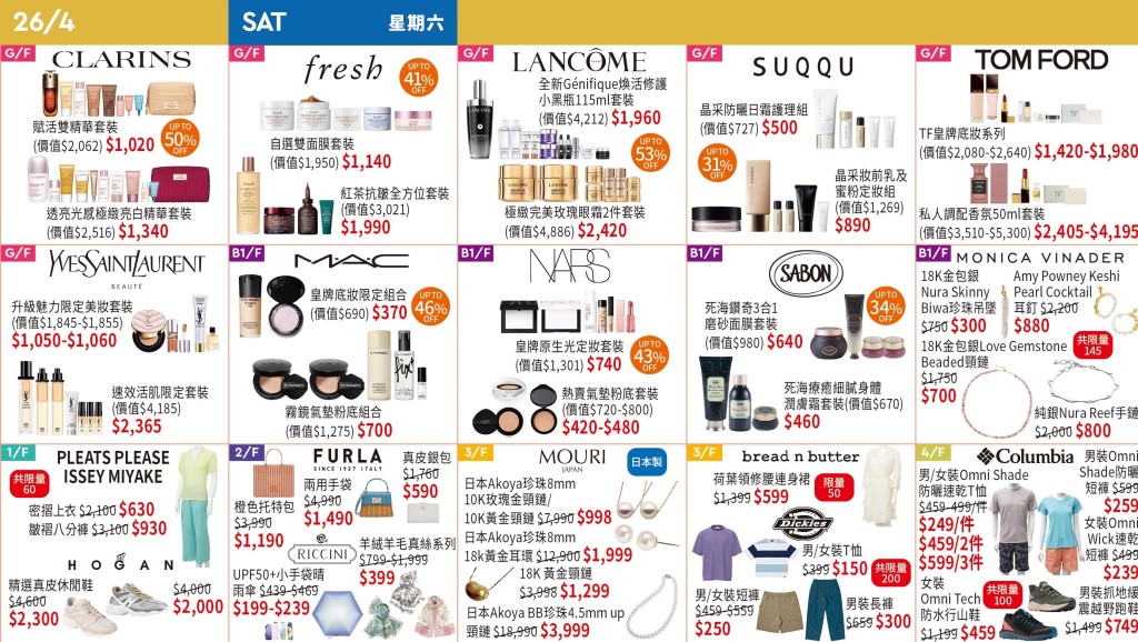 为庆祝崇光40周年,铜锣湾店与启德店举行半年一度“崇光感谢祭 SOGO Thankful Weeks”,首阶段将于4月25日至5月11日推出,优惠涵盖各式特选商品。 崇光实体店感谢祭之先,其网店由即日起至4月24日举行独家预售,各款名牌手袋、化妆护肤品、厨具、行李箱低至14折发售,包括深受女士们欢迎的Kate Spade、Marc Jacobs手袋,以及LANCOME、KIEHL'S、ORIGINS等护肤产品。