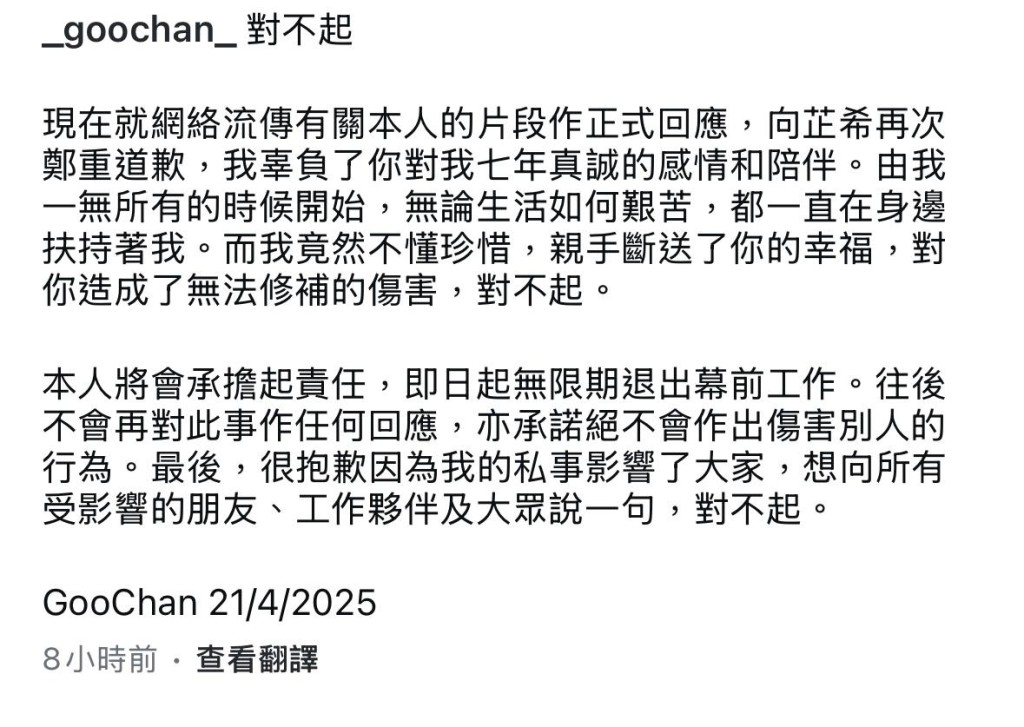 而陈泽鸿21日凌晨在社群发声回应,首先再次向前女友芷希道歉,两人从事业初期就一同打拚,互相扶持,但“我辜负了妳对我七年真诚的感情和陪伴,亲手断送了妳的幸福,对妳造成了无法修补的伤害,对不起”。接着,陈泽鸿宣布无限期退出幕前工作,未来不会再为此出面说明,也不会再做出伤害别人的行为,“很抱歉因为我的私事影响了大家,想向所有受影响的朋友、工作伙伴及大众说一句,对不起”。