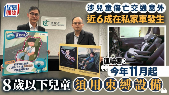 运输署总工程师(道路安全及标准研究)胡建国接受《星岛》访问时表示,8岁以下儿童乘车时发生意外个案,有一半都是乘坐私家车时发生,政府今年2月宣布,由今年11月1日起,除非身高达1.35米,否则8岁以下儿童,不论坐在私家车前排或后排座位,均须使用儿童束缚设备。至于8岁或以上或身高至少1.35米的乘客,则须使用儿童束缚设备或佩戴成人安全带,否则司机不得在任何道路上驾驶私家车。