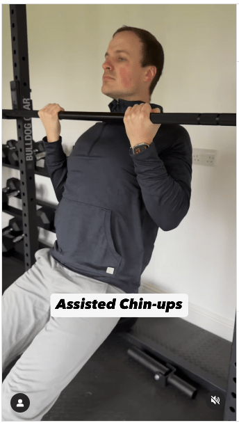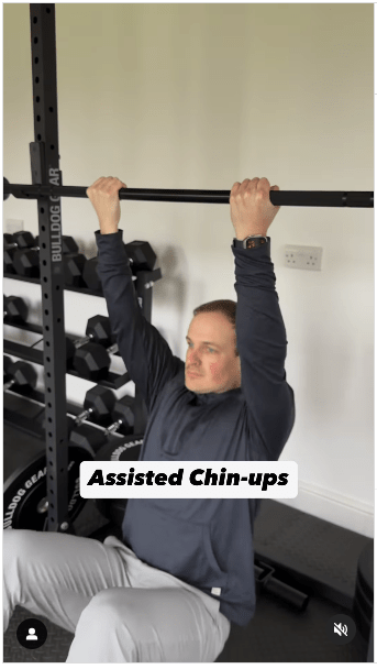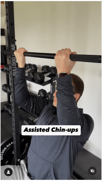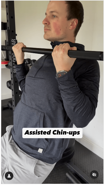 ▲1. 辅助型引体上升步骤:双脚踩在地板上支撑身体,向上拉动身体,直到下巴高于横杆。做这个动作时,想象一下将肩胛骨挤压在一起。IG@olliethompsonhealth