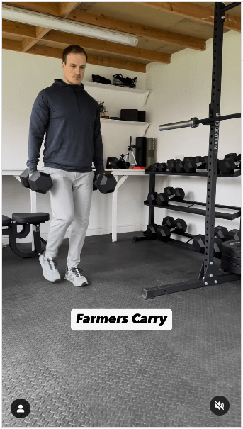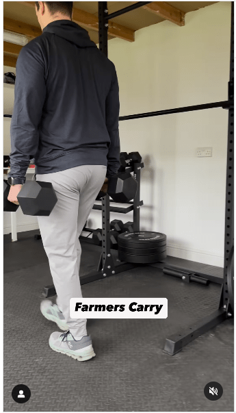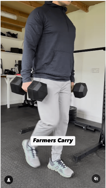 ▲3. 农夫行走步骤:保持身体直立,收紧核心,负重行走。IG@olliethompsonhealth