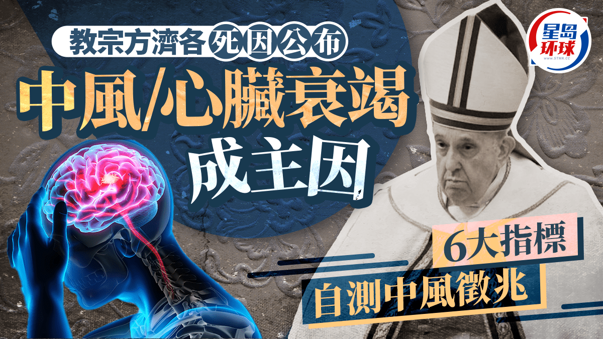 教宗方济各(Pope Francis)当地时间周一(21日)逝世,享年88岁。据梵蒂冈公布的教宗死亡证明,方济各的死因是脑中风导致昏迷和心脏衰竭。事实上,中风具有高度致命性,如不获及时抢救,死亡率可达30%,因此及早辨别中风早期征兆相当重要。有专家曾提出可自测6大中风早期征兆,及时识别中风,争取最佳治疗时间。