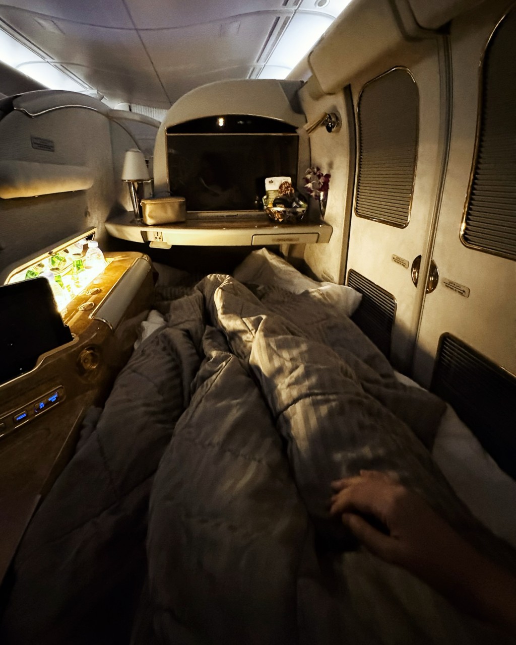 出身小康之家的崔碧珈玩得超豪,大晒如同“超级头等房”的头等机位。从照片可见,崔碧珈乘搭头等机位到迪拜,穿上Tee恤牛仔裤的她,分享了一张关灯在机上睡觉的照片,可以见到她的机位非常宽敞,双脚可以完全伸直之馀,机位更设有小门,私隐度极高。而她分享的另1 张照片则见到她在机上吃的飞机餐非常丰盛,有前菜、主菜,有海鲜、肉类亦有蔬菜。