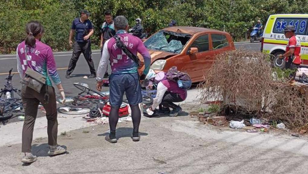 ▲新北市康桥国际学校学生骑乘自行车环岛,22日行经埤头乡彰水路三段,疑似遭一辆逆向行驶的自小客车冲撞,造成7名学生及自小客车驾驶受伤送医。(民众提供/中时新闻网)