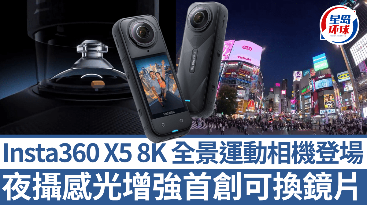 Insta360推出新一代8K全景运动相机X5,除了双感光元件升级至1/1.28吋(英寸),配合三重AI芯片,换上夜景摄录8K全景片仍然清晰明亮,且支持全新5.7K 60fps运动HDR,同时首创InstaFrame模式同步拍摄平面与360º全景,加上可自行更换镜头保护镜片及续航力延长,相信能吸引现有X3、X4用家换机升级!