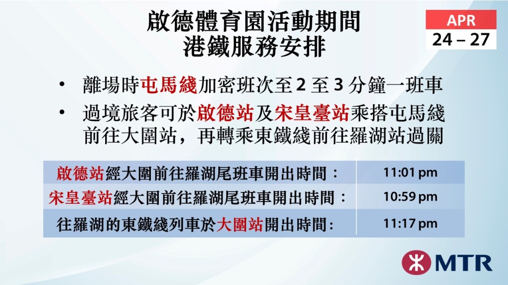 过境旅客可于启德或宋皇台站乘搭屯马线前往大围站,再转乘东铁线前往罗湖站过关。 由于演唱会预计于晚上10时后结束,较为接近屯马线转乘东铁线往罗湖站的尾班车时间。 公司提醒过境旅客须留意尾班车时间,呼吁旅客提早计划行程。