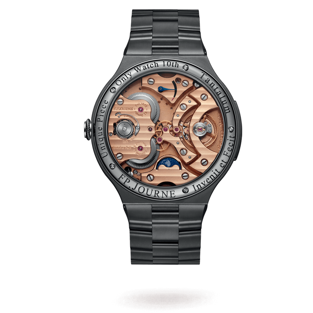 Only Watch版本采用蓝色表盘,表壳和链带均以稀有的钽金属制作。新推出的量产版除表盘以炭灰色大明火珐琅制作,表壳、表圈和链带都以碳化钨制造。此物料的制作难度极高,皆因碳化钨的维氏硬度高达1350,莫氏硬度为9,几乎与蓝宝石看齐。硬度高,制作难度自然也高。F.P. Journe今次够胆将此表量产,证明品牌已掌握相关技术,话虽如此,制作碳化钨表壳也需要花上较平常钢壳多十倍的时间。除了要具有一定信心及高超能力去处理碳化钨这物料,F.P. Journe在全新Chronomètre Furtif上还展现了他们对不同材质运用和加工方面的纯熟工艺。例如腕表的底盖、表壳侧的缓冲边、表圈环、表冠和链带上的表扣,全都以钽金属制造,而链带的折叠扣则以钛金属制,表盘材质就是白金,另时分秒三支指针均为不锈钢,还有所搭载的1522手上链机芯就一如品牌传统为玫瑰金制。至于腕表的功能,直径42mm的Chronomètre Furtif表面上是普通大三针,实则是品牌首款量产的大三针款式,从表底看还见到设有动力储备显示,以及鲜有会放在表底的月相。