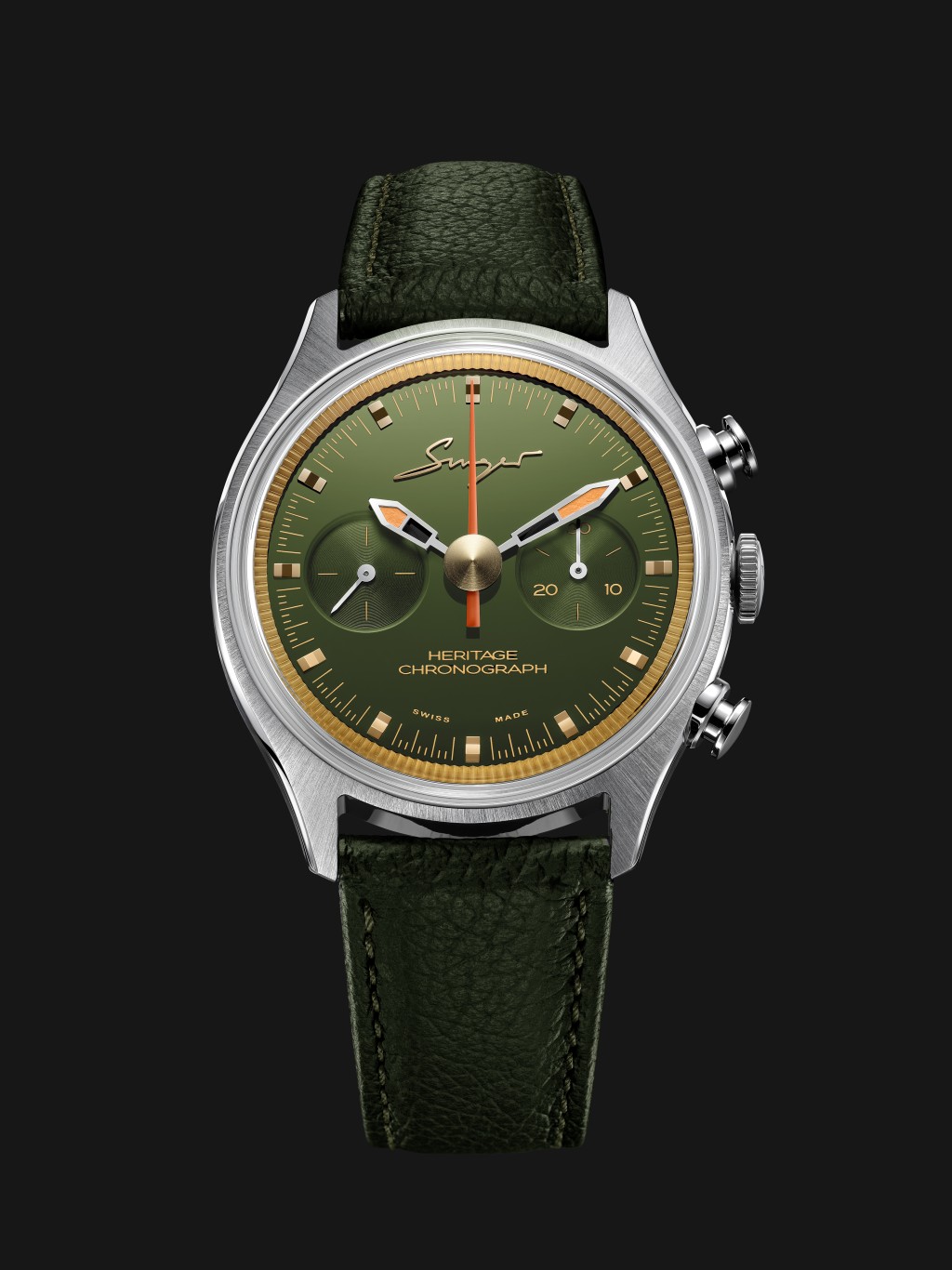 Singer Reimagined全新推出的Heritage黑面SR601和绿面SR602两款计时腕表,所搭载的是货真价实,来自1974年的经典Valjoux 236手上链导柱轮计时机芯。此机芯是以当年生产但从未使用过的全新库存零件,配合现代手工打磨修饰和调校而制成,今次两枚限量100枚的新表面世,可说是Singer对昔日经典大作致敬一种方式。