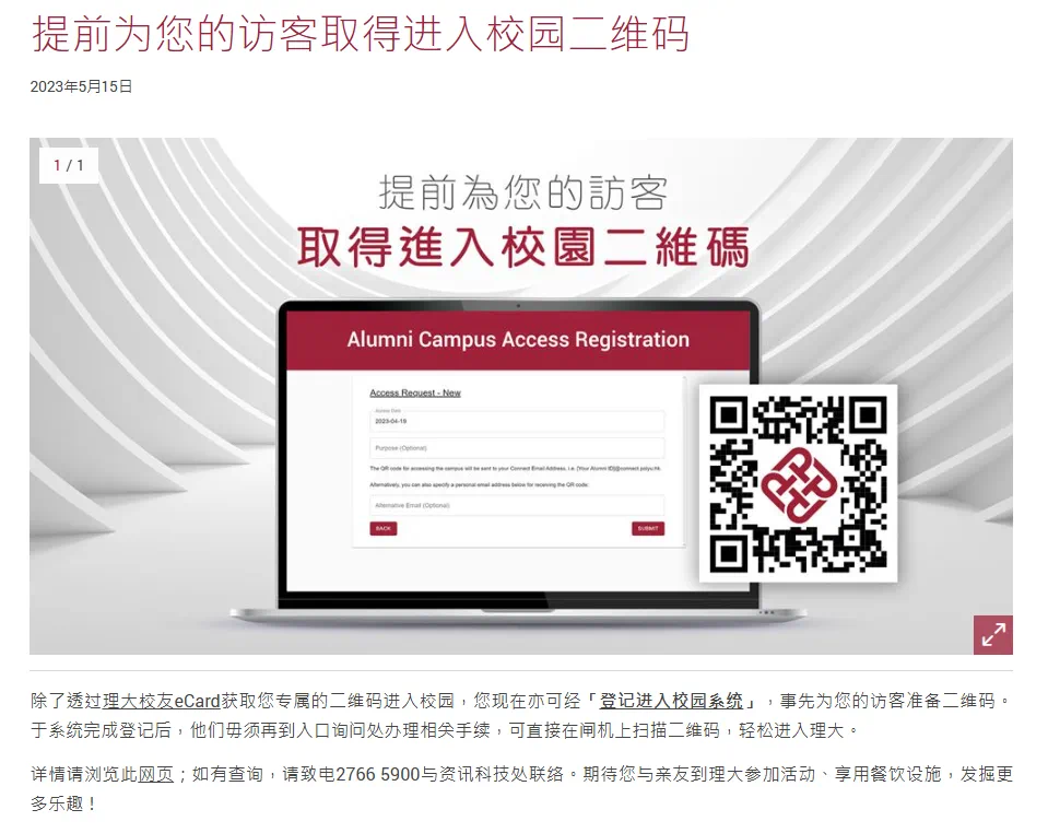 想参观理大的内地生,需要找理大的在校生,通过“登记进入校园系统”为你完成登记。登记后可直接在校园的闸机上扫描二维码,轻松进入理大。