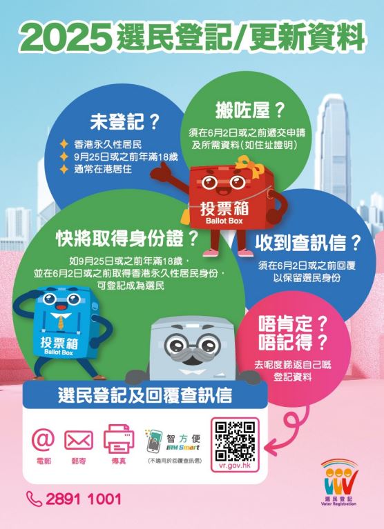 凡持有身份证明文件、在今年9月25日或之前年满18岁及通常在香港居住的香港永久性居民,均符合资格登记为地方选区选民。已登记的选民/投票人无须重新登记,但假如其住址或其他登记资料有任何变更,则同样应于法定限期6月2日或之前向选举事务处提交更改资料申请。