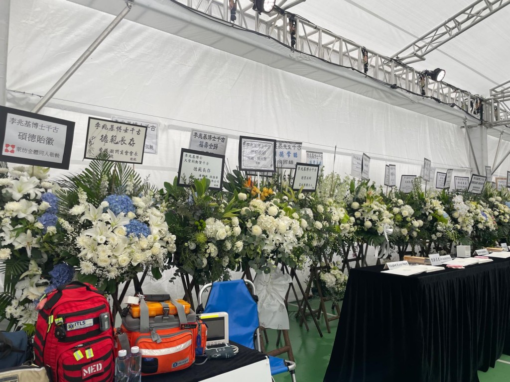 ▲李兆基设灵,大型帐篷悼念区内有花池,载有不同人士留下的致意。