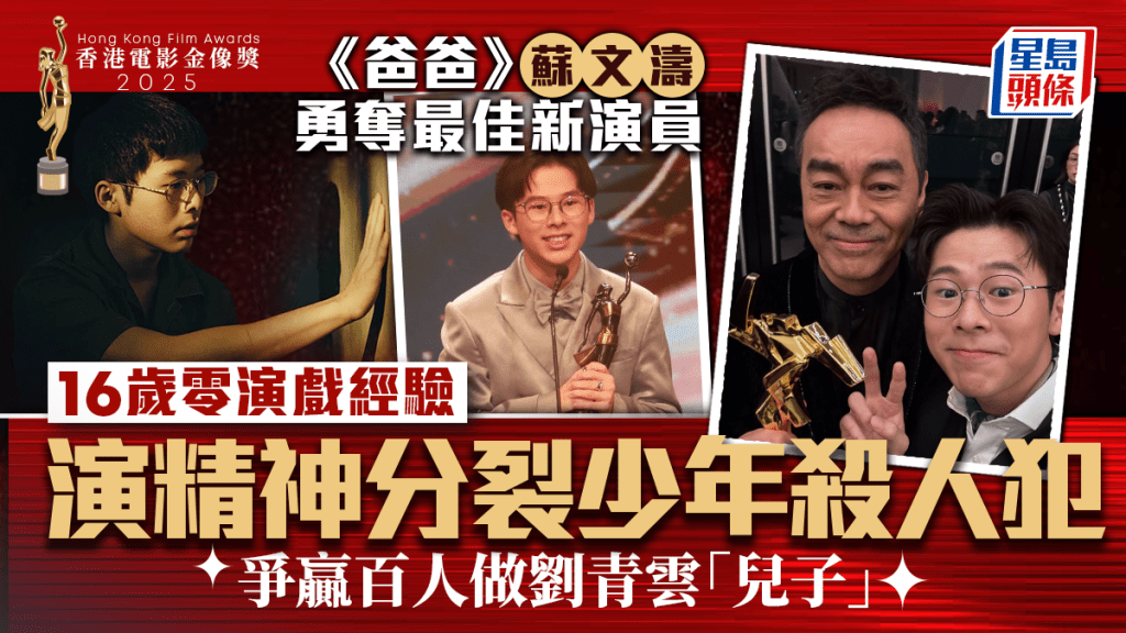 第43届香港电影金像奖于今年4月27日(周日)举行,金像奖大会早前已公布金像奖2025完整提名名单。现年18岁的苏文涛(Dylan)凭电影《爸爸》(Papa)中杀人犯阮厚明一角,入围金像奖2025最佳新演员。苏文涛大热夺得最佳新演员奖,由影帝梁朝伟手上夺过奖座,他特别多谢《爸爸》内的父母刘青云、谷祖琳等,他呆萌样表示感谢:“多谢你成家……”引起笑声,他续指:“多谢我哋成家先有呢套戏喺度。”至于“新晋导演”则由Robin Lee凭《香港四径大步走》夺得。