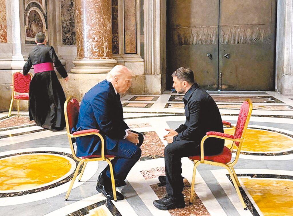 ▲特朗普许多谈判目标尚未实现,俄乌战争仍在持续,且特朗普已多次扬言撤手不管。图为特朗普与泽连斯基4月26日在梵蒂冈会谈。(路透)