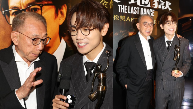 金像奖2025|第43届香港电影金像奖昨晚(27日)圆满举行,大热电影《破·地狱》获得5个奖项,当中包括“最佳电影原创歌曲”,由林家谦(Terence)主唱的《破·地狱》主题曲《普渡众生》夺得。昨晚亦有出席金像奖颁奖礼的英皇集团主席杨受成博士,在庆功宴上被传媒蜂拥追访,期间被问到有关林家谦的提问,即时引发一段林家谦与杨受成博士的妙问妙答,影片一夜晚在网上疯传,网民纷纷大赞杨老板非常可爱又亲切,而林家谦又非常无厘头。