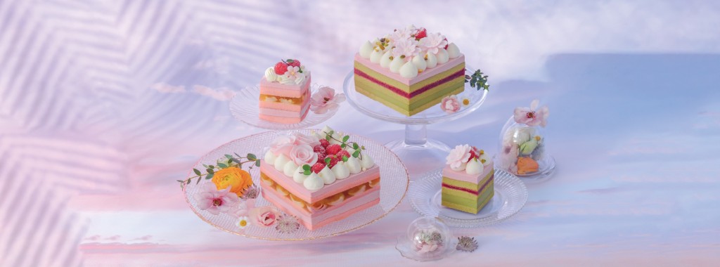 稀少糖粉红番石榴草莓蛋糕为玫瑰造型,采用法国制造、无添加糖的粉红番石榴果蓉及草莓果蓉;法式热带水果芝士蛋糕以花艺为灵感,酸甜果香配上顶层晶莹的芒果热情果啫喱,带来清新味觉层次。