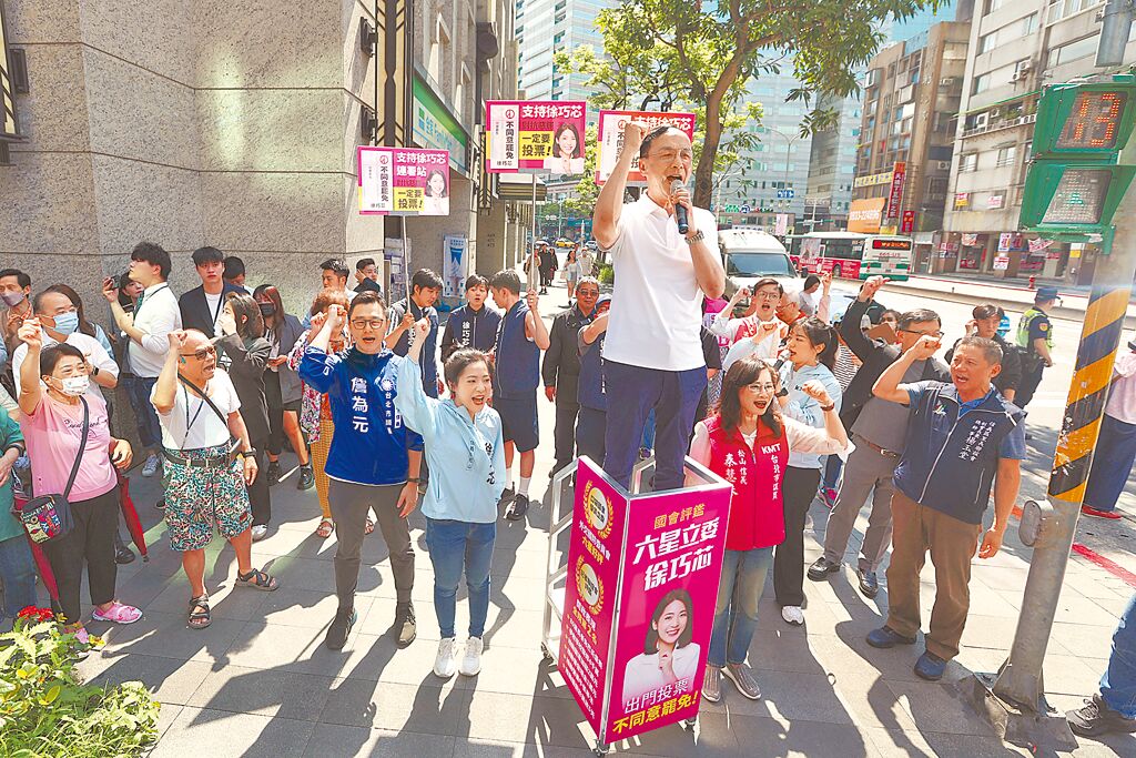 ▲国民党主席朱立伦(中)2日前往台北市永春市场外就“反恶罢战独裁”进行街讲。中时