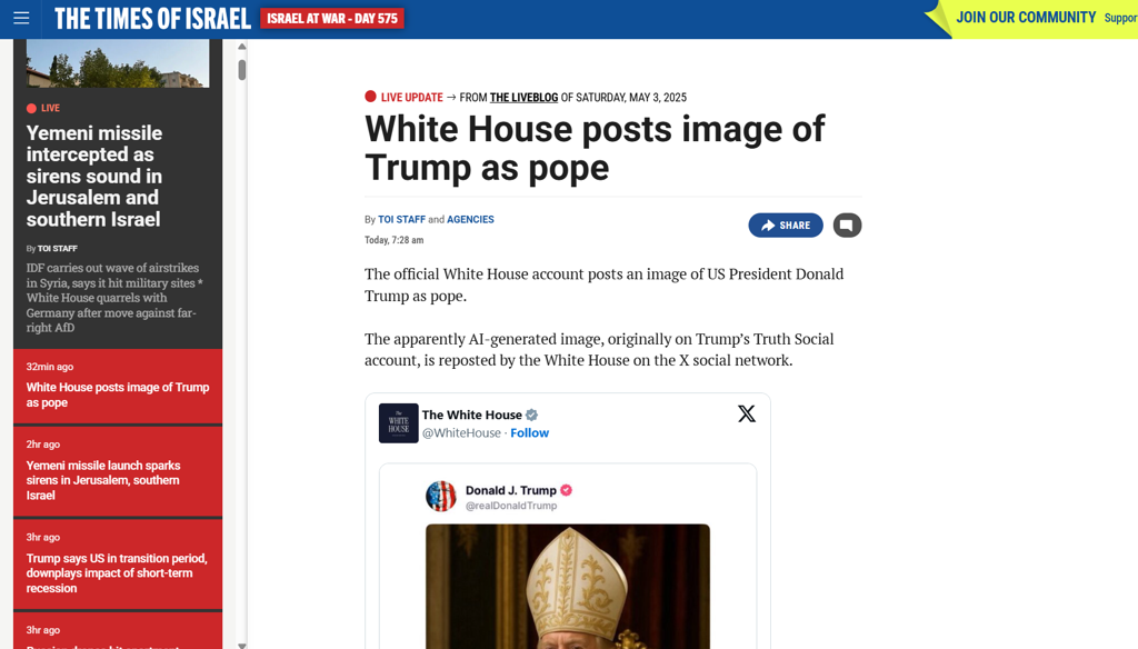 根据美国《新闻周刊》、《以色列时报》(Times of Israel)等报导,美国总统特朗普周五晚间在他自旗下社交媒体Truth Social上发布一张自己身穿教宗服的搞笑图片。在网络上引发正反两极反应。令人吃惊的是,白宫在X平台上的官方账号竟然转发了这张图片。不过《新闻周刊》随后撤下报导。