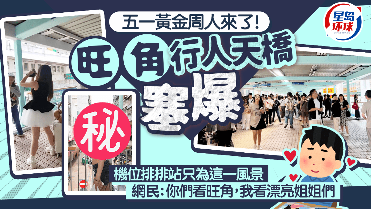 截至2日,最新数据显示,五一假期近38万人次经更口岸入境,当中内地客占约23.9万人,其中23.9万人来自内地,内地旅客继续逼爆本港各大景点。 其中,在接驳旺角东站及MOKO广场,横跨旺角道及洗衣街的一段行人天桥,更是人山人海。 小红书上,就有网民分享现场情况,整条行人天桥通道近半都挤满人。 从一些片段中可见,不乏年轻旅客手持相机、脚架在栏杆边,排排企拍照,相当热闹。