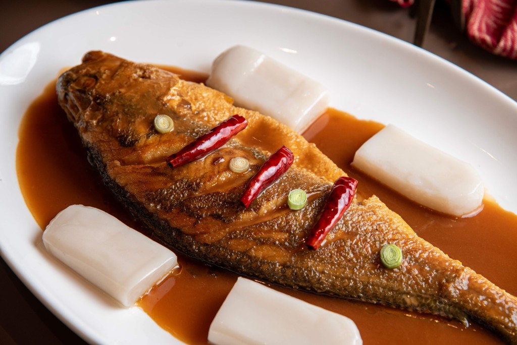 在主菜方面,“千岛脆虎虾球”以炸至金黄的虎虾为特色,外焦内嫩,搭配独具风味的千岛酱,甜酸平衡,令人回味无穷。另外,“红烧五头南非鲍鱼黑豚方肉”则结合了鲍鱼的鲜美与黑毛猪的嫩滑,酱汁十分浓郁,交织出悠长的美味感受。最后以“祝寿蟠桃”为母亲节盛宴作结,寓意健康长寿。