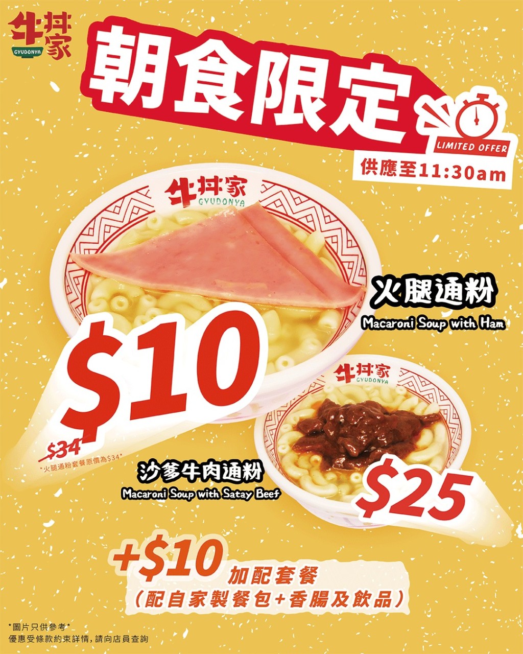 连锁日式丼饭专门店“牛丼家GYUDONYA”日前推出一项超值早餐优惠,只需$10即可享用火腿通粉,另可加配自家制面包、香肠及饮品,和沙嗲牛肉通粉选择,对于需要快速补充能量的上班族或学生来说,绝对是一个既方便又经济的选择!