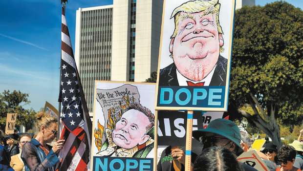 ▲特朗普上任百日政绩不获加州选民支持,图为民众在洛杉矶街头抗议特朗普和马斯克。美联社