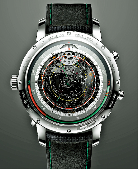 独一无二的Solaria,花了长达8年时间研发,由1521个零件组成,拥有41项复杂功能、5项天文功能及西敏寺三问报时功能,已申请13项专利。45mm表壳的厚度仅14.99mm,表盘正面设有4个计时盘,其中两个可分别显示最多5种复杂功能,背面则结合星空图和计时功能。西敏寺钟乐大自鸣装置是精密的音乐序列报时装置。天文复杂功能可实时显示太阳的位置、高度、中天时间和赤纬角度,同时结合双秒追针计时与天体显示功能,可计算星座或特定恒星出现所需的时间,此天体追踪功能更是全球首创。搭载品牌自家研发的3655机芯。