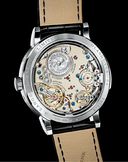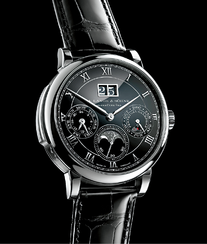 不说不知,全新Minute Repeater Perpetual原来是朗格首款三问万年历腕表。不要惊讶,品牌的确推出过不少功能更复杂的三问表,然而只是结合万年历的三问表,今次确实是第一次。对朗格来说,今次的尝试难度不算高,腕表采用铂金壳之余,表盘也内填黑色珐琅,12点位是品牌标志性的双视窗大日历,当然不少得以人手绘制的月相显示。