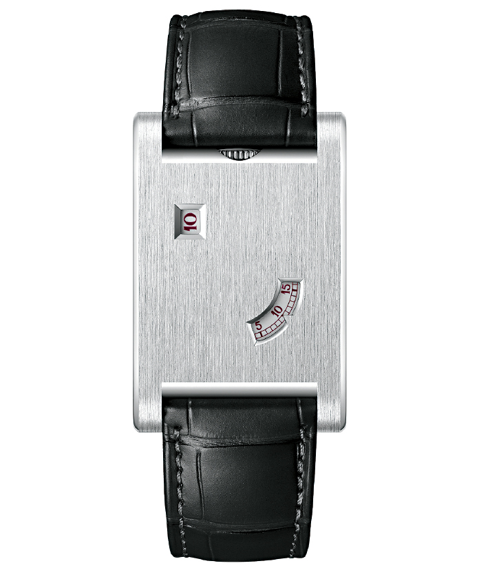 来自Cartier Privé系列的Tank à Guichets腕表带来4款新作,其中3款(黄金、玫瑰金及铂金)沿用1928年推出的原型设计,12点位设小时视窗,6点位是分钟视窗。图示这款铂金特别限量版,小时视窗设于10点位,分钟视窗在4点位置,构成独特的对角设计。新表搭载卡地亚工作坊9755 MC型手动上链机械机芯,具备跳时机制显示小时及转盘机制显示分钟功能。铂金表壳具有缎面效果,表耳经抛光处理。阿拉伯数字时标和分钟轨道是酒红色,配黑色鳄鱼皮表带。
