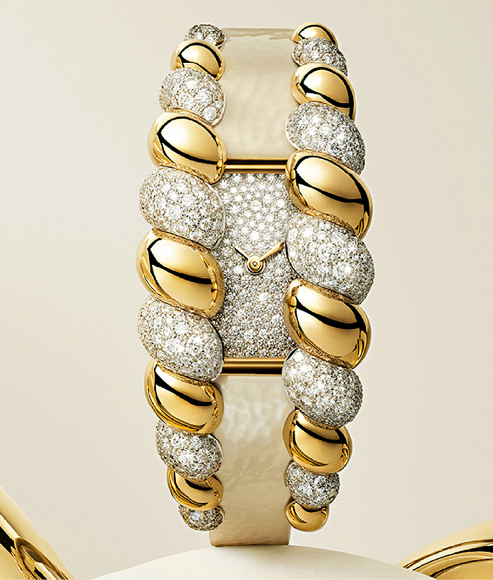 卡地亚腕表的造型设计向来独树一帜,Maillon de Cartier、Coussin de Cartier及Reflection de Cartier都呈现出品牌大胆创新的立体几何美学精髓,新推的Tressage腕表正是今年的突出之作。新表的表壳选用黄金及白色黄金制作,表壳与针扣式表扣镶嵌了466颗共重6.3卡的明亮式切割圆钻。白色黄金表盘则镶嵌156颗共重0.6卡的明亮式切割圆钻,整枚腕表在不同角度下都绽放耀目钻光。此腕表配以亮面米色皮革表带。同系列另备3款分别为没有镶钻或全钻设计的版本。