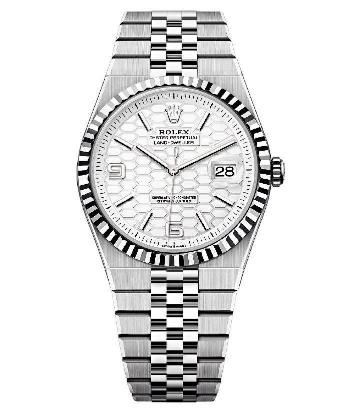 Roger Federer率先让这枚Land-Dweller曝光,未正式发布已引起关注。新表的表壳与全新的纤薄Flat Jubilee表带以一体式设计,透明底盖亦属首次推出,表盘饰以雷射蜂巢图案,表面的镂空数字及时标配备Chromalight夜光显示。搭载的全新7135型机芯,频率达5赫兹,相当于每小时摆动36,000次,被视为品牌的一大突破。新表备有40mm及36mm两种尺寸及不同材质型号,包括白金白色表面、铂金冰蓝色表面及玫瑰金白色表面,并分别配以三角坑表圈或钻石表圈。
