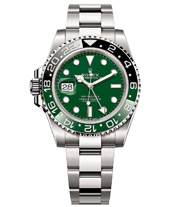 绿黑“雪碧”圈的GMT-Master II,以专为右手佩戴而设的姿态,在2022年首度登场,今年带来全新版本。这款左表冠腕表亦是劳力士首款陶瓷表面作品,绿色表面配绿黑双色数字表圈,皆采用Cerachrom陶瓷材质制作。表壳以整块白金铸造,同样以白金制的表带安装了易调链节延展系统,可轻易延长表带约5毫米。新表搭载3285型自动上链机械机芯,配备日历功能,可以24小时制显示第二时区时间,动力储备约70小时。
