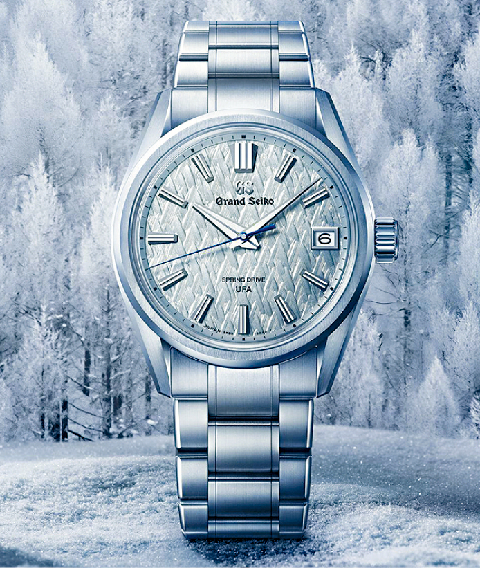 GS曾经在1969年推出月差+/-1分钟的V.F.A.机械机芯,后来在2004年以Spring Drive 9R65机芯将精准度推高至月差+/-15秒。今年品牌将这个标准大幅度提升至以年差计,全新Spring Drive 9RB2 U.F.A.机芯(Ultra Fine Accuracy)的精准度是年差+/-20秒,是现今最为精准的发条驱动腕表机芯。首款搭载新机芯的SLGB003,表盘上的三角几何纹理设计,取材自信州时之匠工房东面的雾峰高原,在冬天被霜雪覆盖的冰霜森林景致,其呈现的银蓝色调,洋溢隆冬气息。