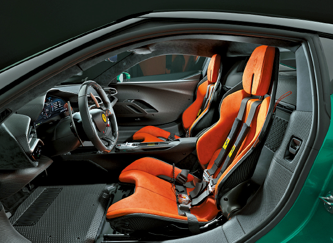 全套特制车身扰流组件,空气力学源自296 Challenge、296 GT3,以及FXX K赛车,整个全新头铲、中间和两边开孔车头盖、车尾两侧独立小翼片等,再配合车尾主控扰流翼,可提供最大435kg气流下压力(于250km/h),相比296 GTB多了20%。车厢换上轻量碳纤维门板、桶形座椅等。