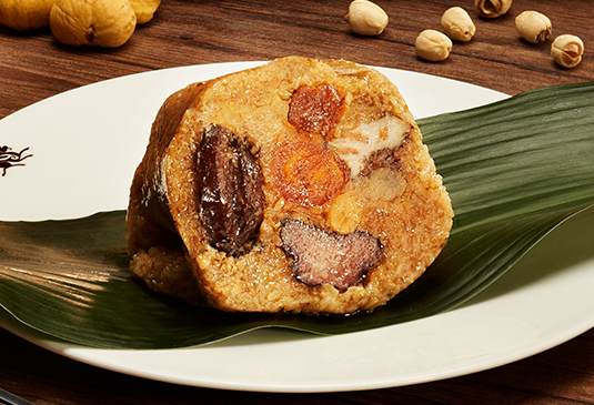 金殿干鲍瑶柱裹蒸粽以清香荷叶裹满馅料,包括南非吉品干鲍鱼、顶级瑶柱、上等花菇、关刀猪腩肉、鸡腿肉及湖南湘江全莲子,配上油心咸蛋黄及绿豆,香气与味道兼备;金殿日本红豆咸肉粽则用上清甜不腻的上等日本红豆配搭油心咸蛋黄、关刀猪腩肉及软熟糯米,结合咸甜滋味。而充满特色家乡风味的金殿福建粽,糯米先以酱油、五香粉及葱头炒至色泽油亮,再包裹冬菇、栗子、虾米碎以及关刀猪腩肉,味道鲜美丰润。