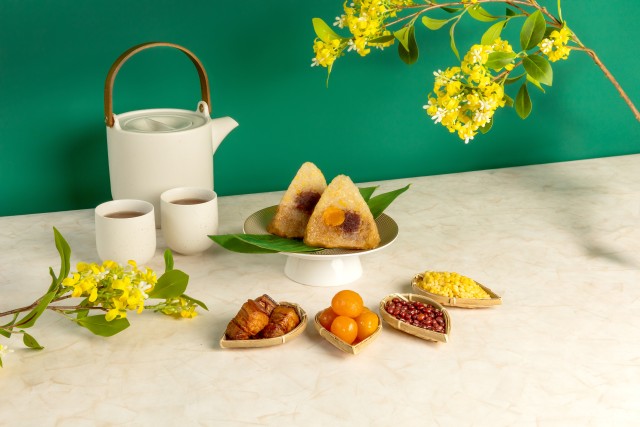 此外,今年酒店亦推出素食之选,“富豪至尊新猪肉素粽”采用新猪肉,融合糯米、黑糯米、花生、藜麦及多种豆类,配上精心炒制的栗子,重塑传统咸肉粽滋味。另外两款素粽“富豪至尊陈皮桂花豆沙碱水粽及富豪至尊莲蓉碱水粽”,前者将烟韧的糯米搭配特选的红豆蓉,再加入老陈皮和淡雅桂花,啖啖清甜;后者则采用上乘香滑莲蓉,甜而不腻,配上绵密的糯米,口感丰富。